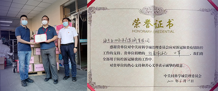 第一时间投入医用口罩生产,支持抗疫行动,先后向西北旺地区、花园路街道、中关村科学城捐献口罩与防暑降温物资。